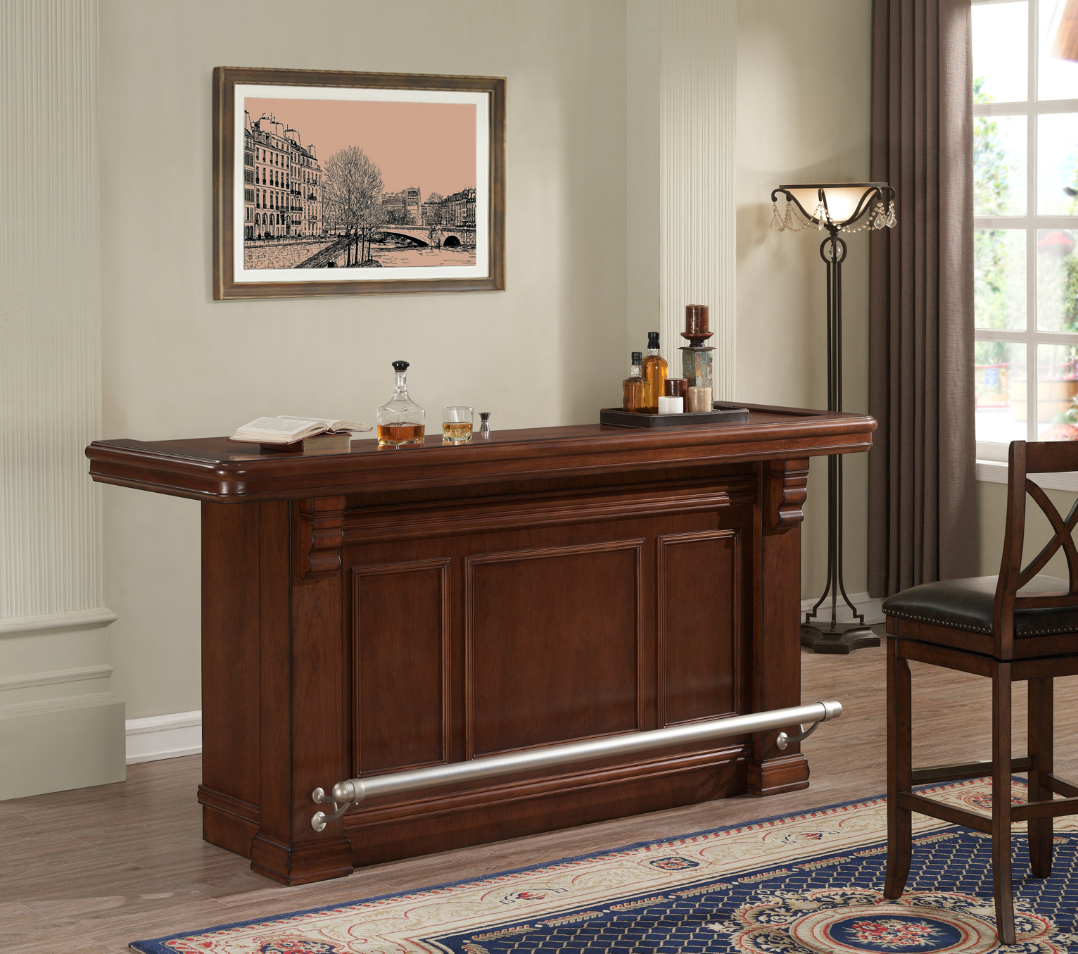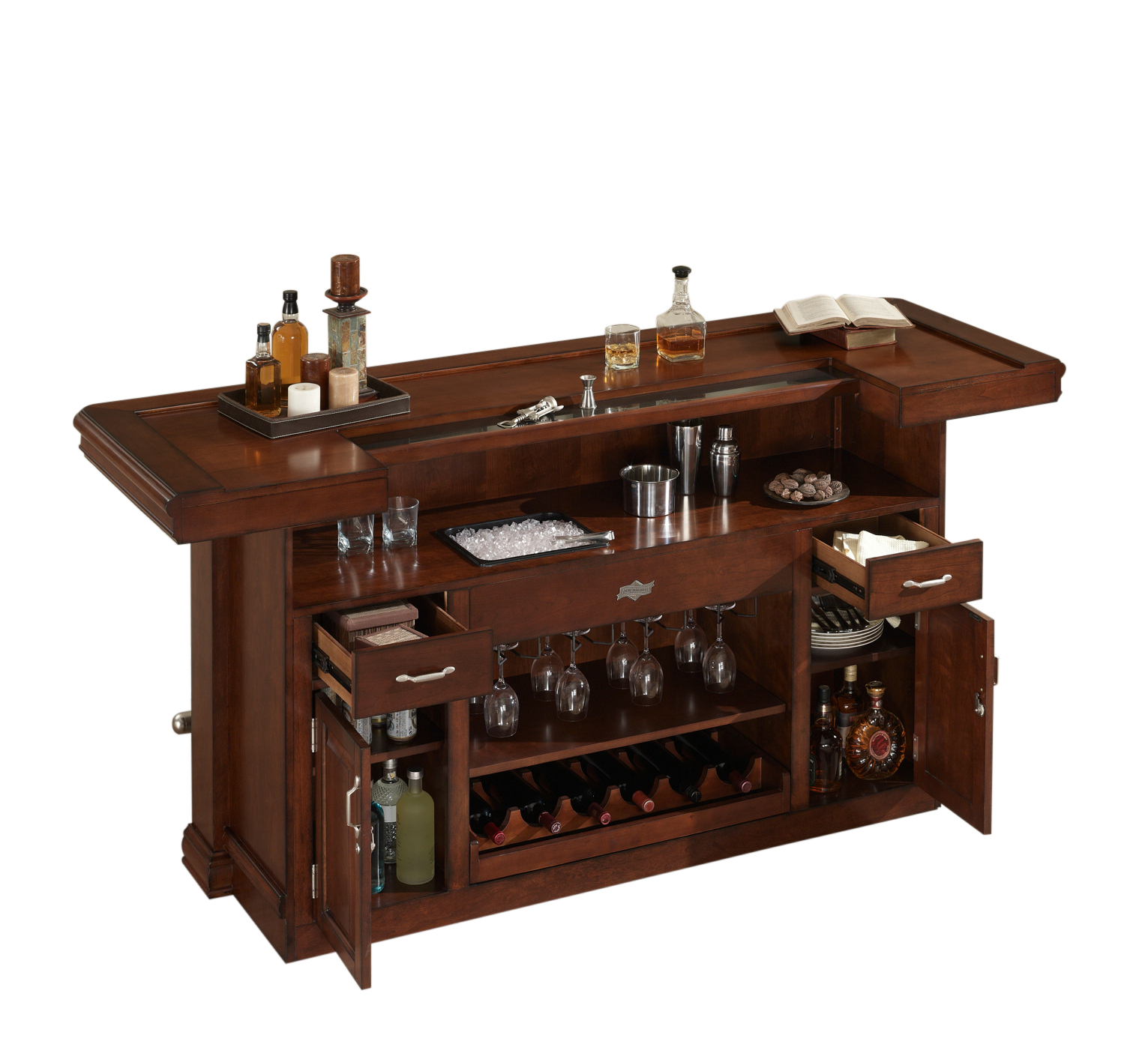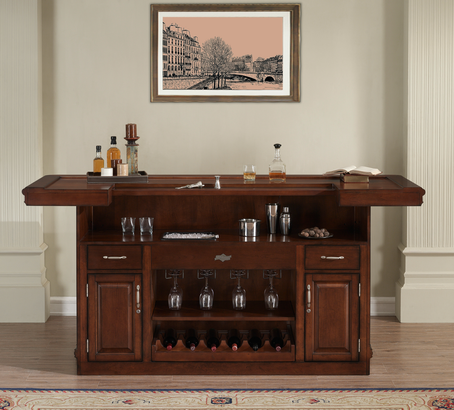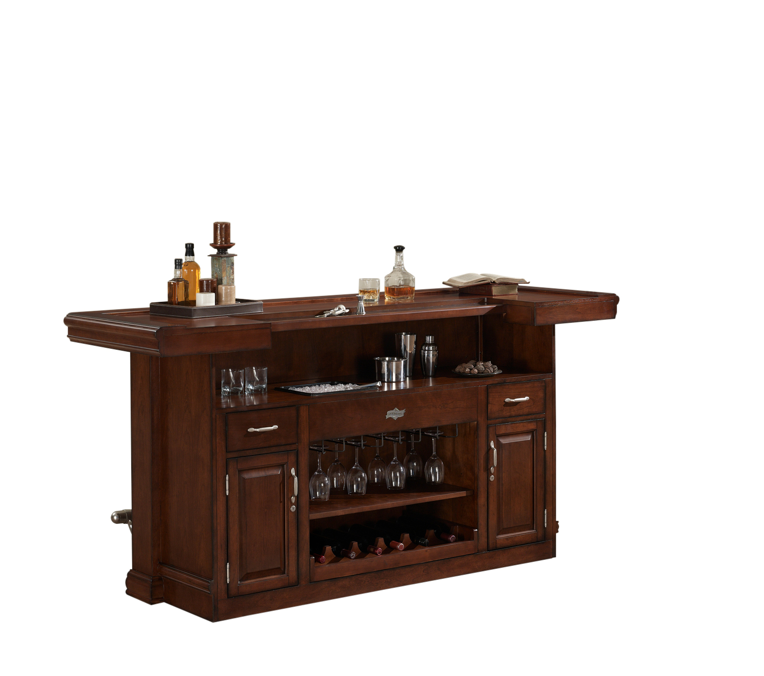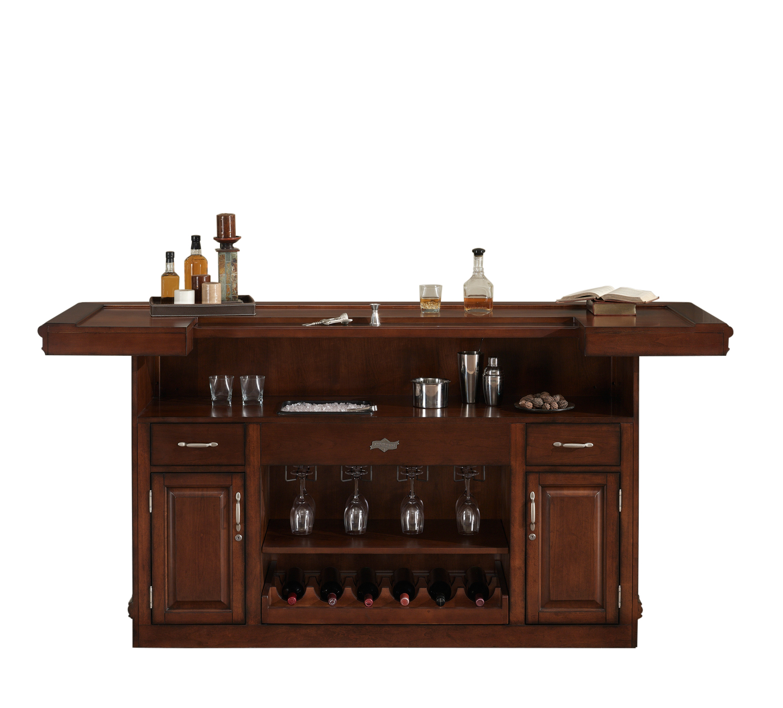 Este bar de 88″ tiene un acabado Navajo con herrajes de acero cepillado. Incluye un soporte para los pies, una hielera, portacopas, dos estantes extraíbles para botellas de vino, amplios estantes, gabinetes con cerradura y cajones de fácil deslizamiento.