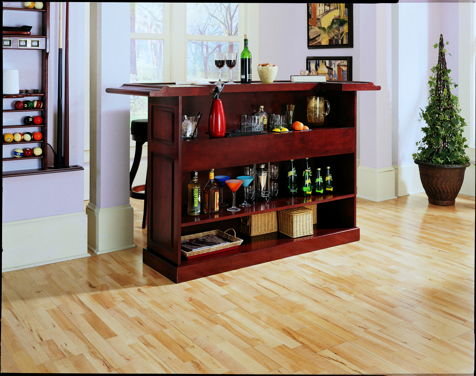 El bar Lexington tiene un acabado de estilo Tudor inglés e incluye un cubo de hielo y dos compartimentos para botellas, muchos estantes de almacenamiento y un hermoso borde de álamo.