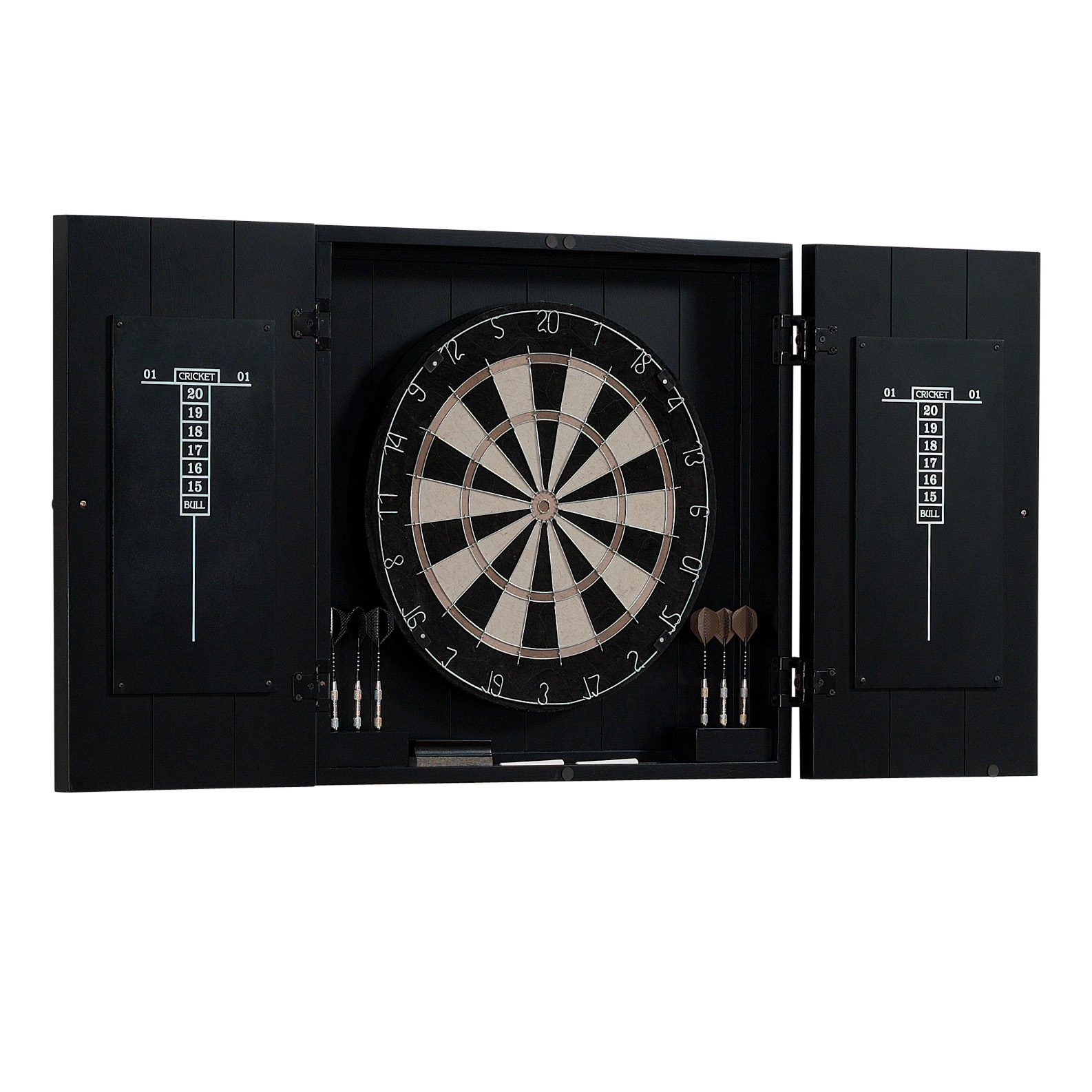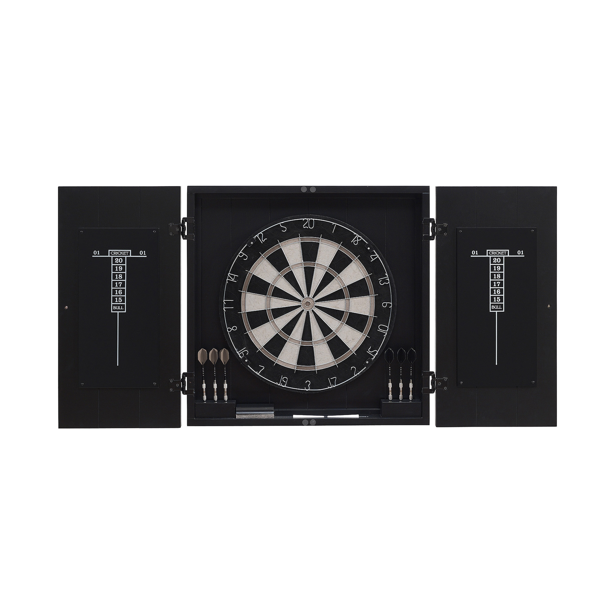 O alvo de dardos Vienna é o toque final perfeito para a sala de jogos ideal. Inclui um gabinete artesanal com um design elegante e minimalista. Dentro do gabinete encontram-se um alvo de cerdas de qualidade profissional e dois quadros de pontuação.