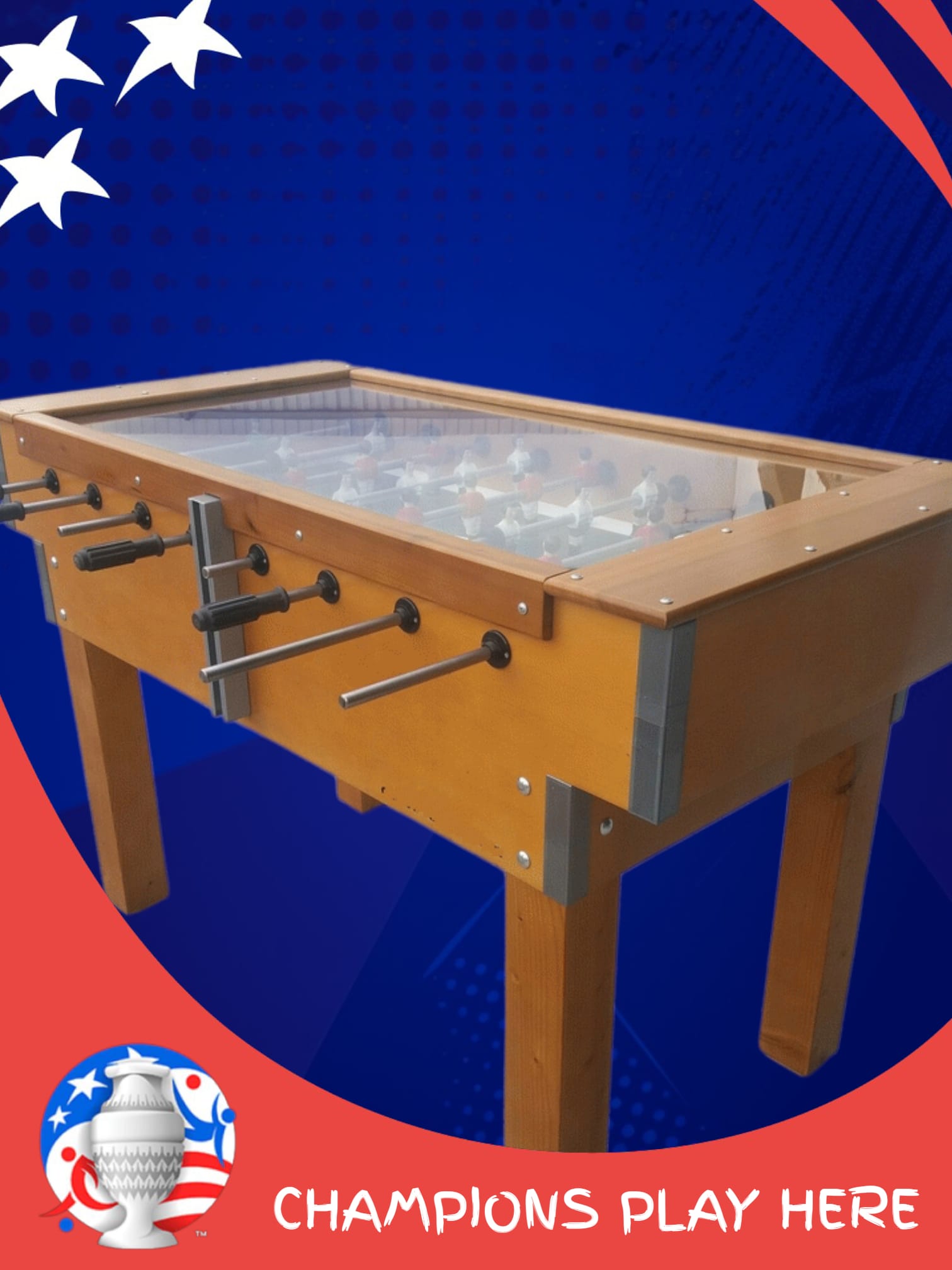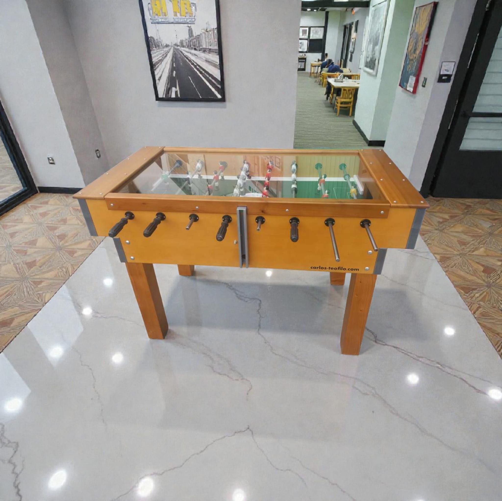 Mesa de matraquilhos com tampo de vidro temperado protetor para maior segurança, ideal para escolas, proporcionando momentos divertidos e em segurança.